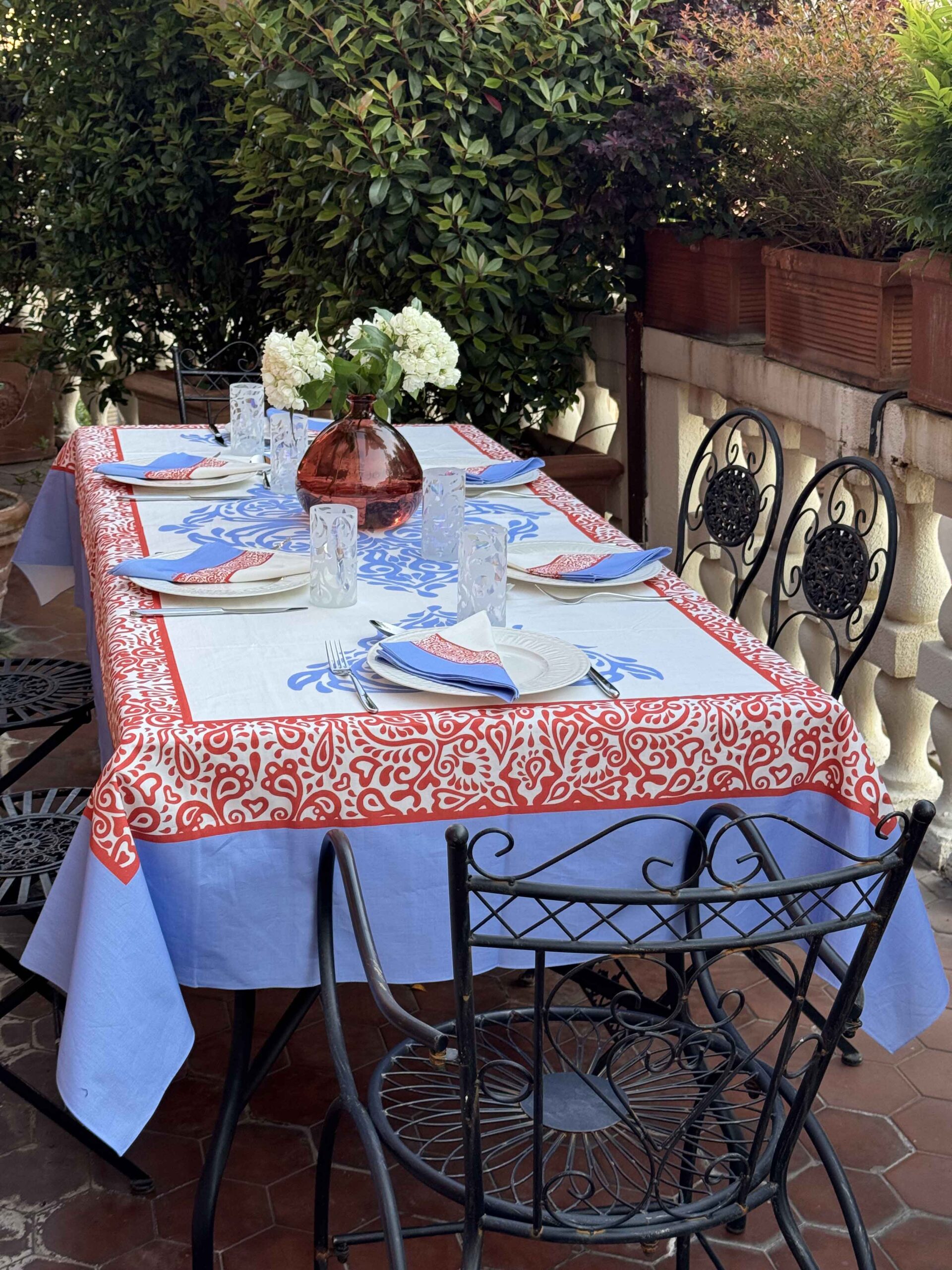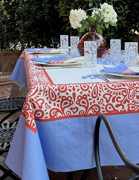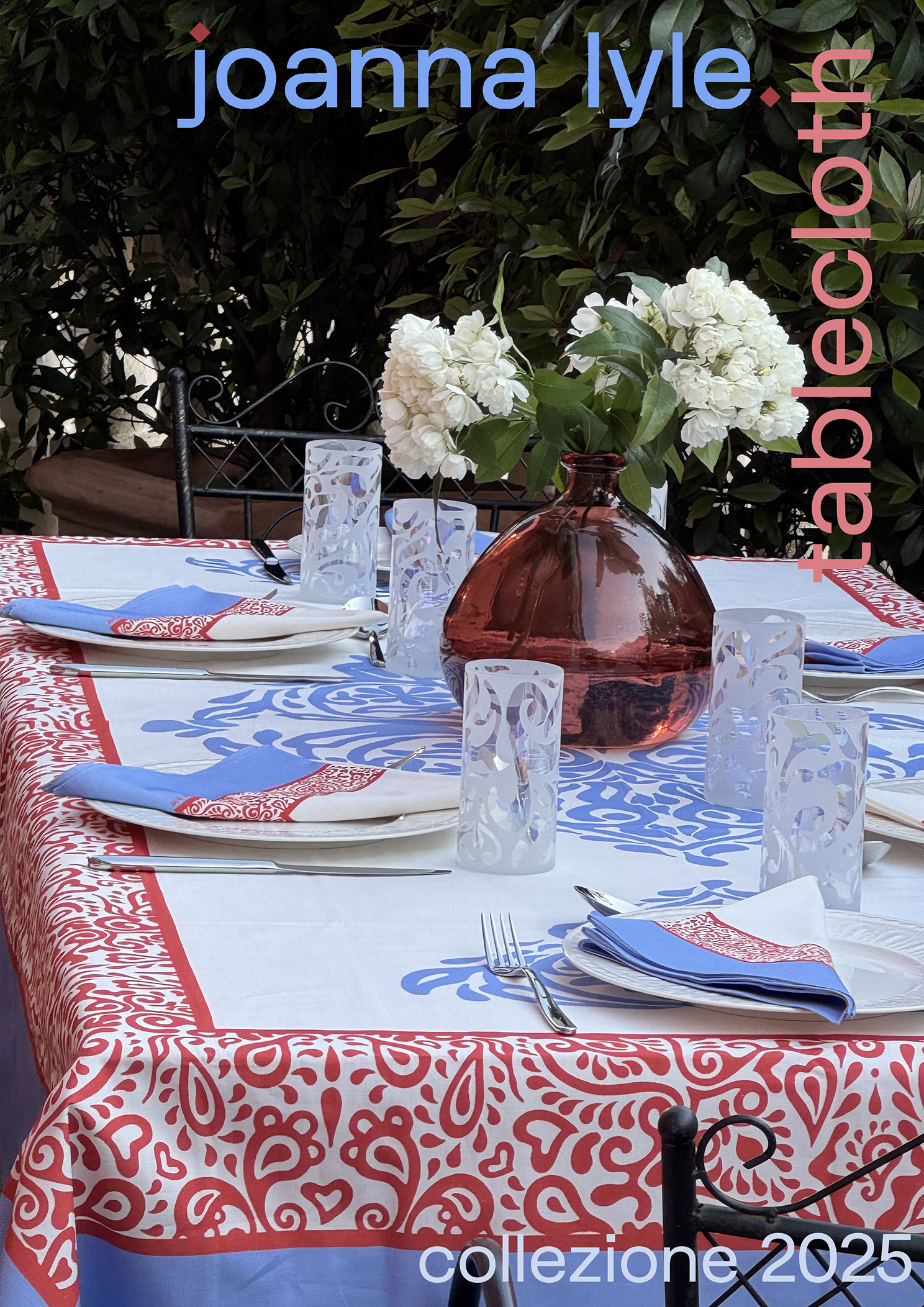 Joanna Lyle tablecloths are a mix of Italian exuberance and British sobriety.