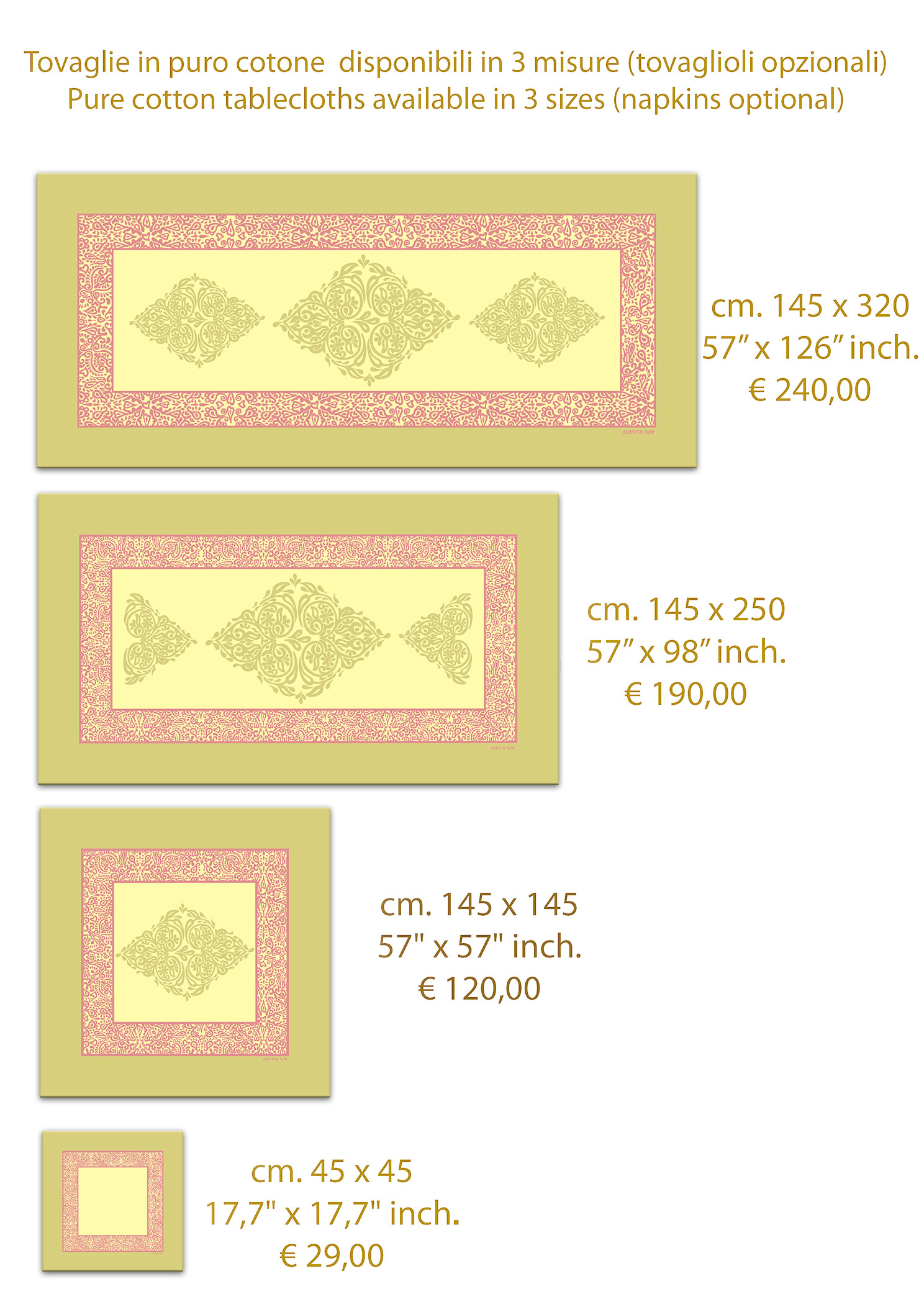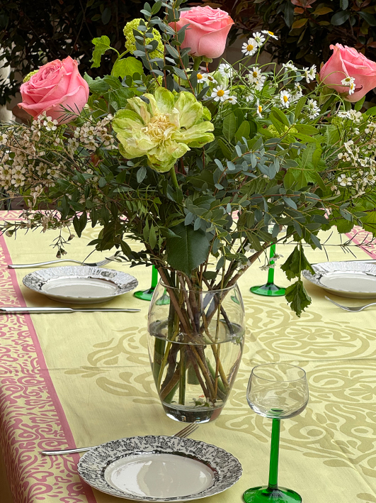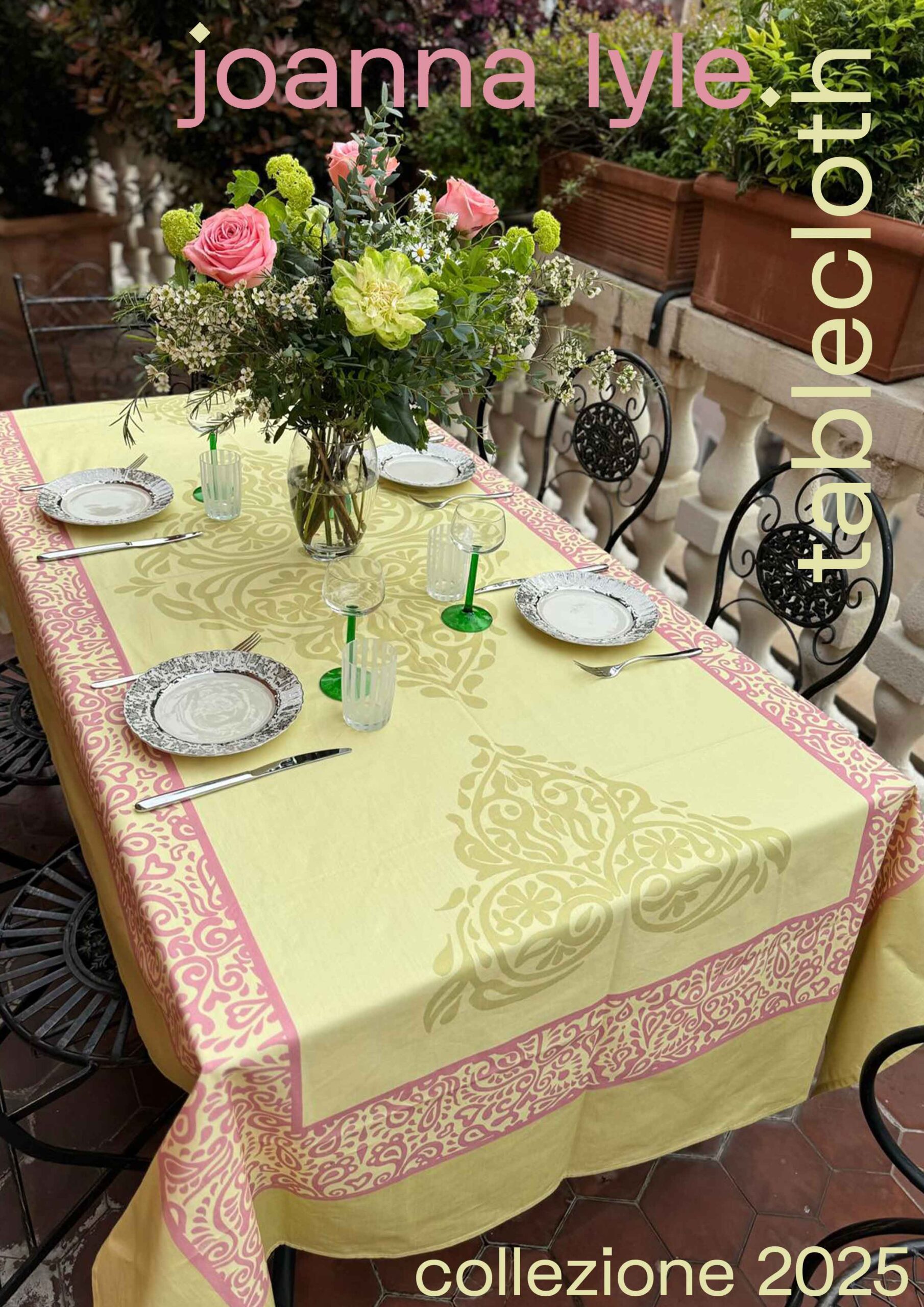 Joanna Lyle tablecloths are a mix of Italian exuberance and British sobriety.