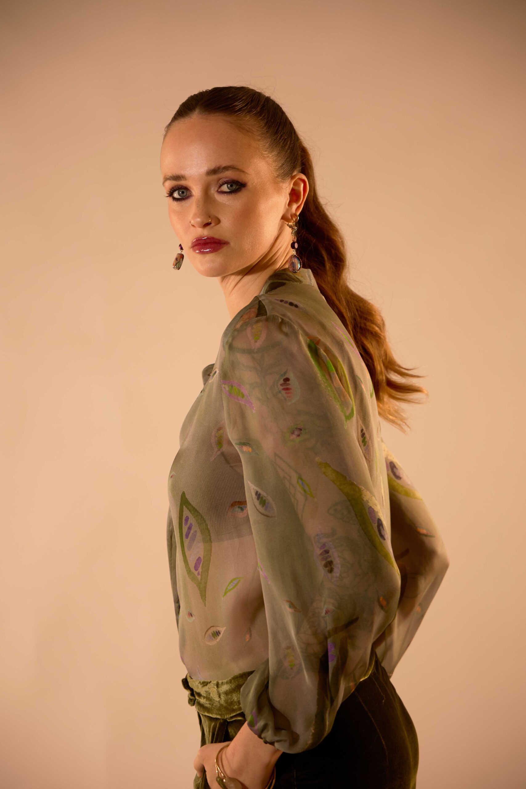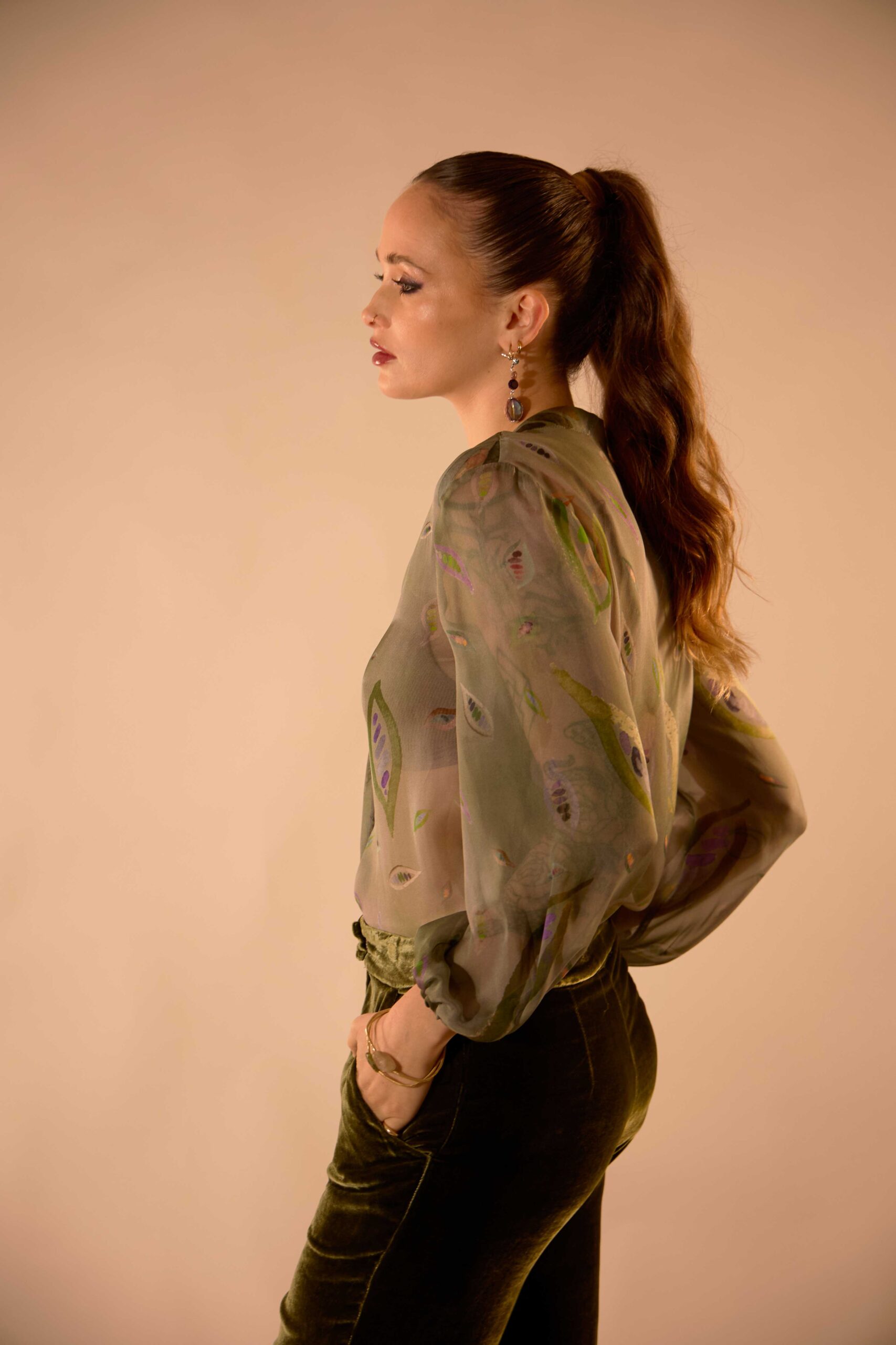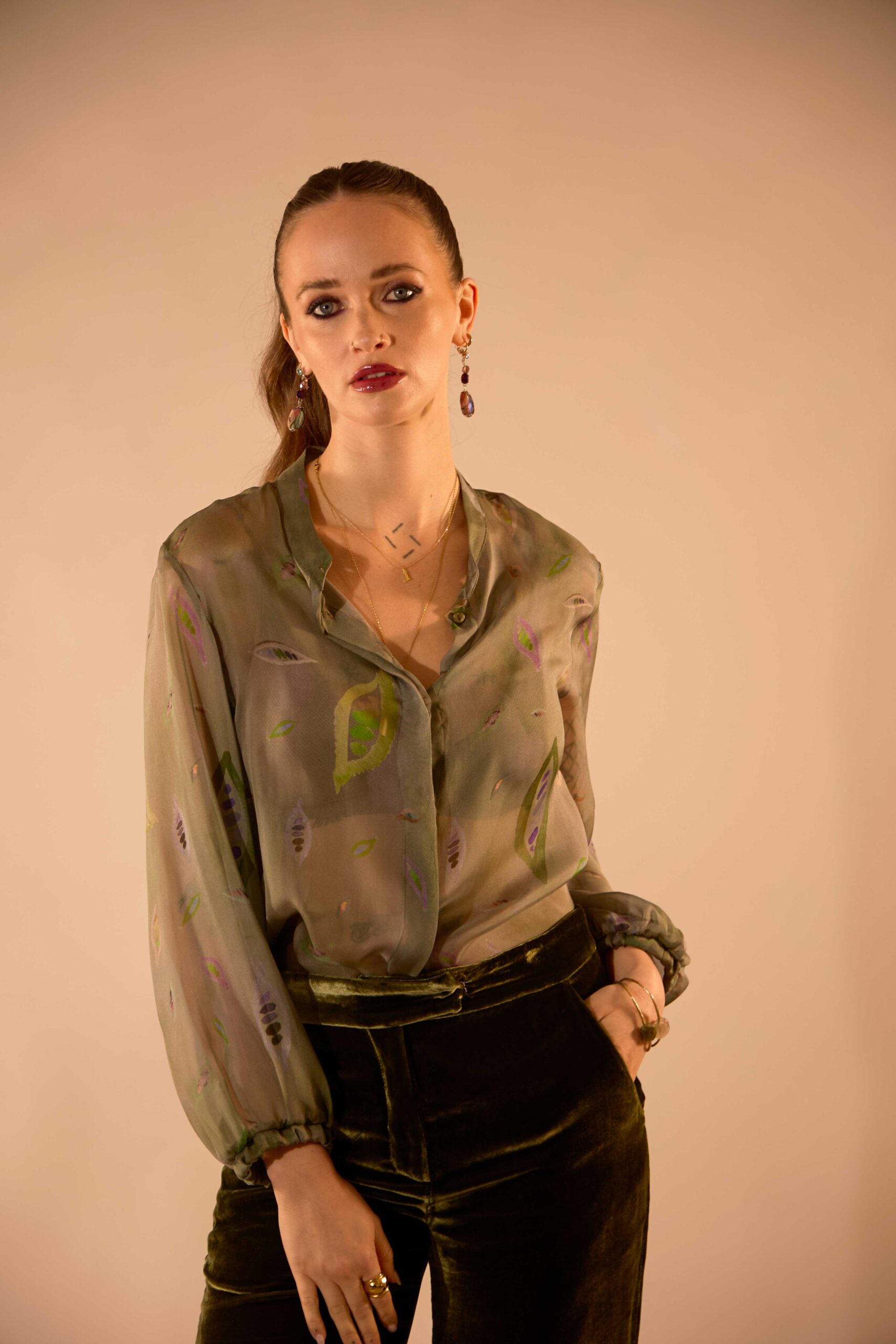 Loose fitting, mandarin collar blouse, in pure silk crepe de chine, bell-shaped sleeves finished with elastic at the cuff.