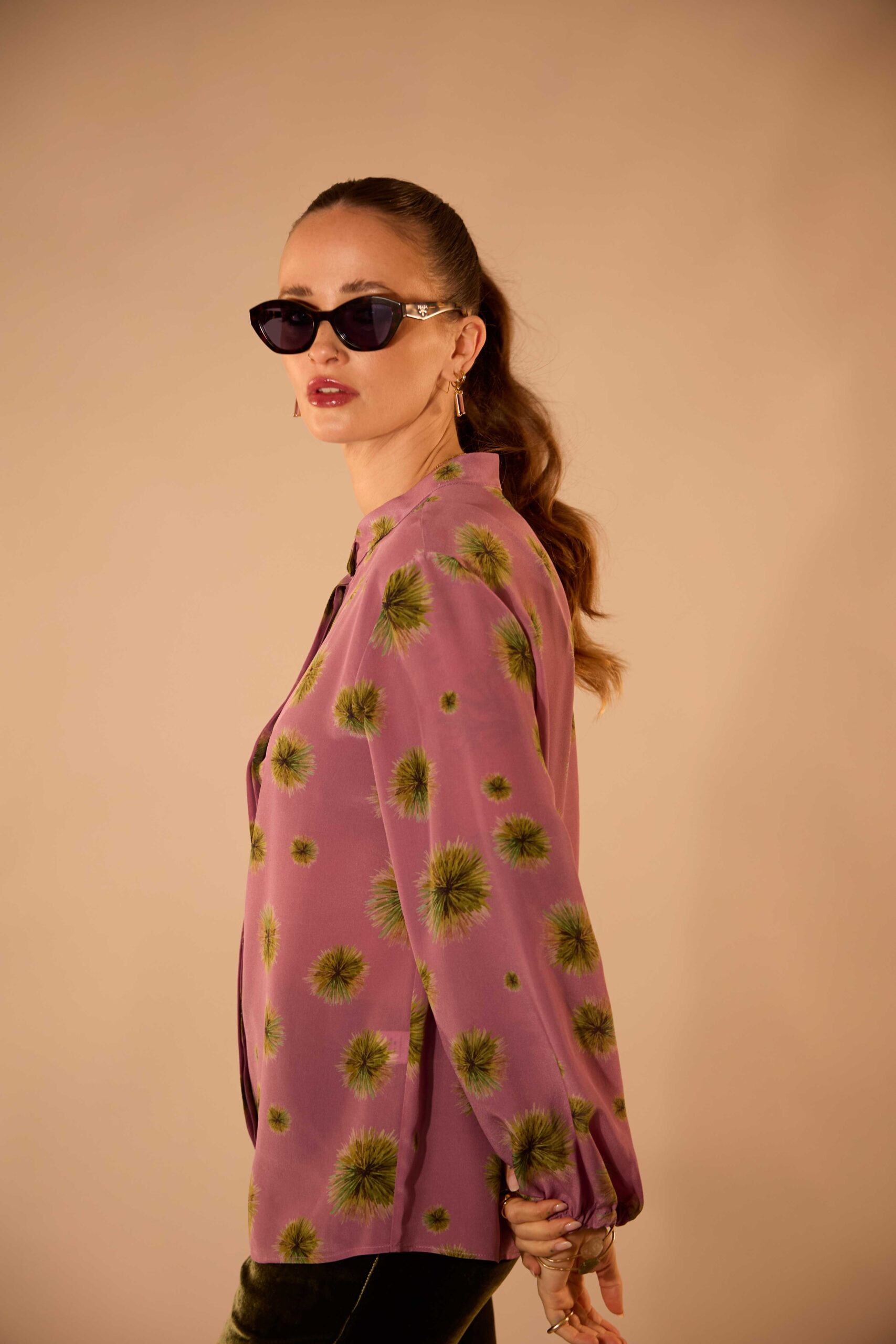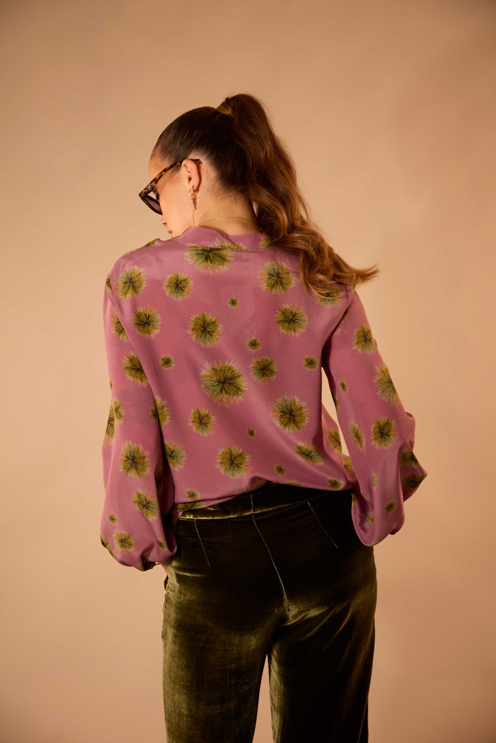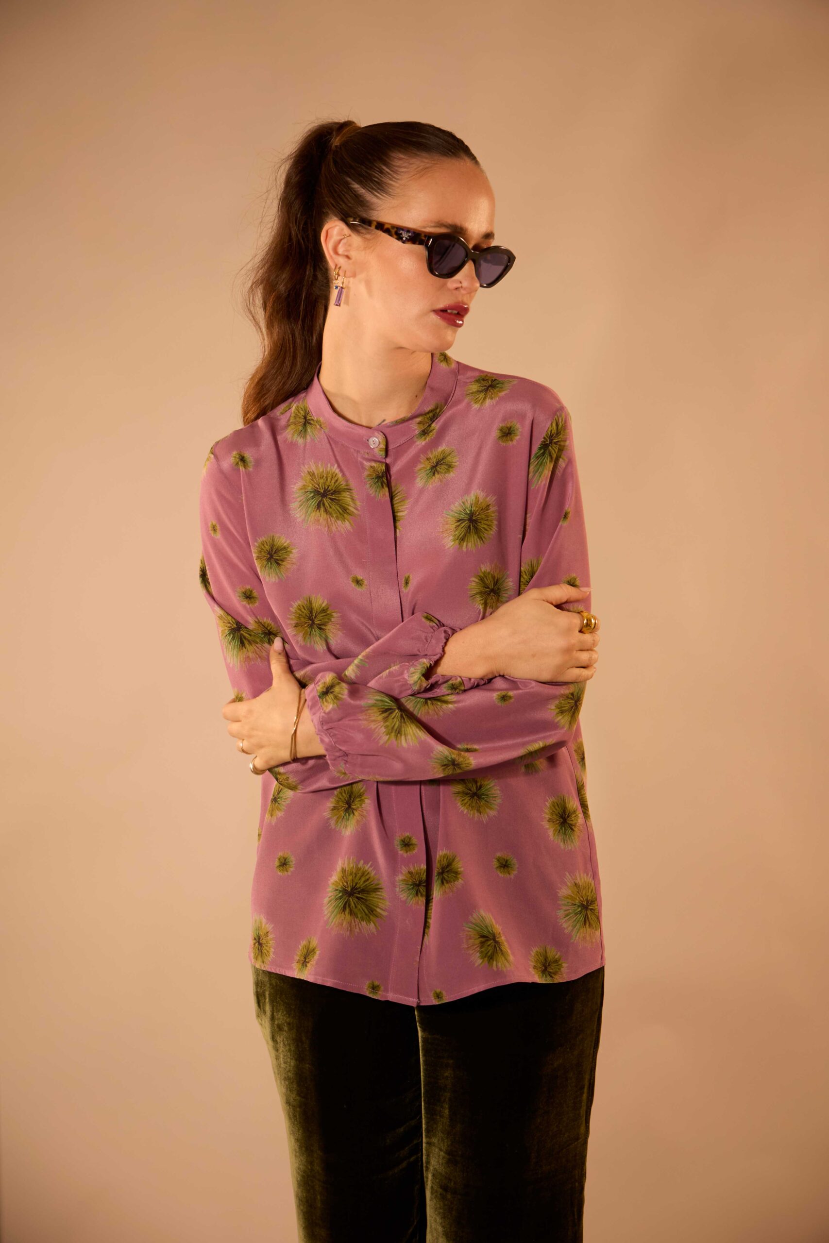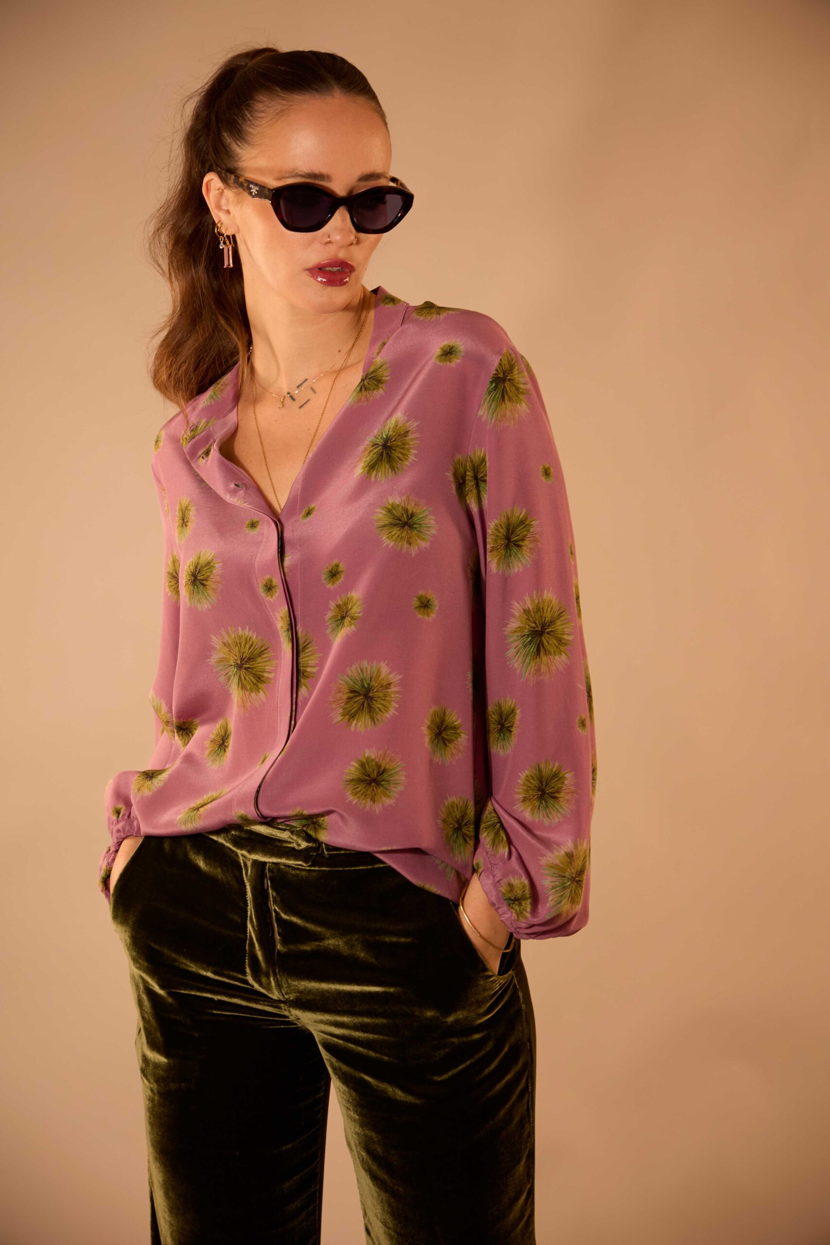 Loose fitting, mandarin collar blouse, in pure silk crepe de chine, bell-shaped sleeves finished with elastic at the cuff.