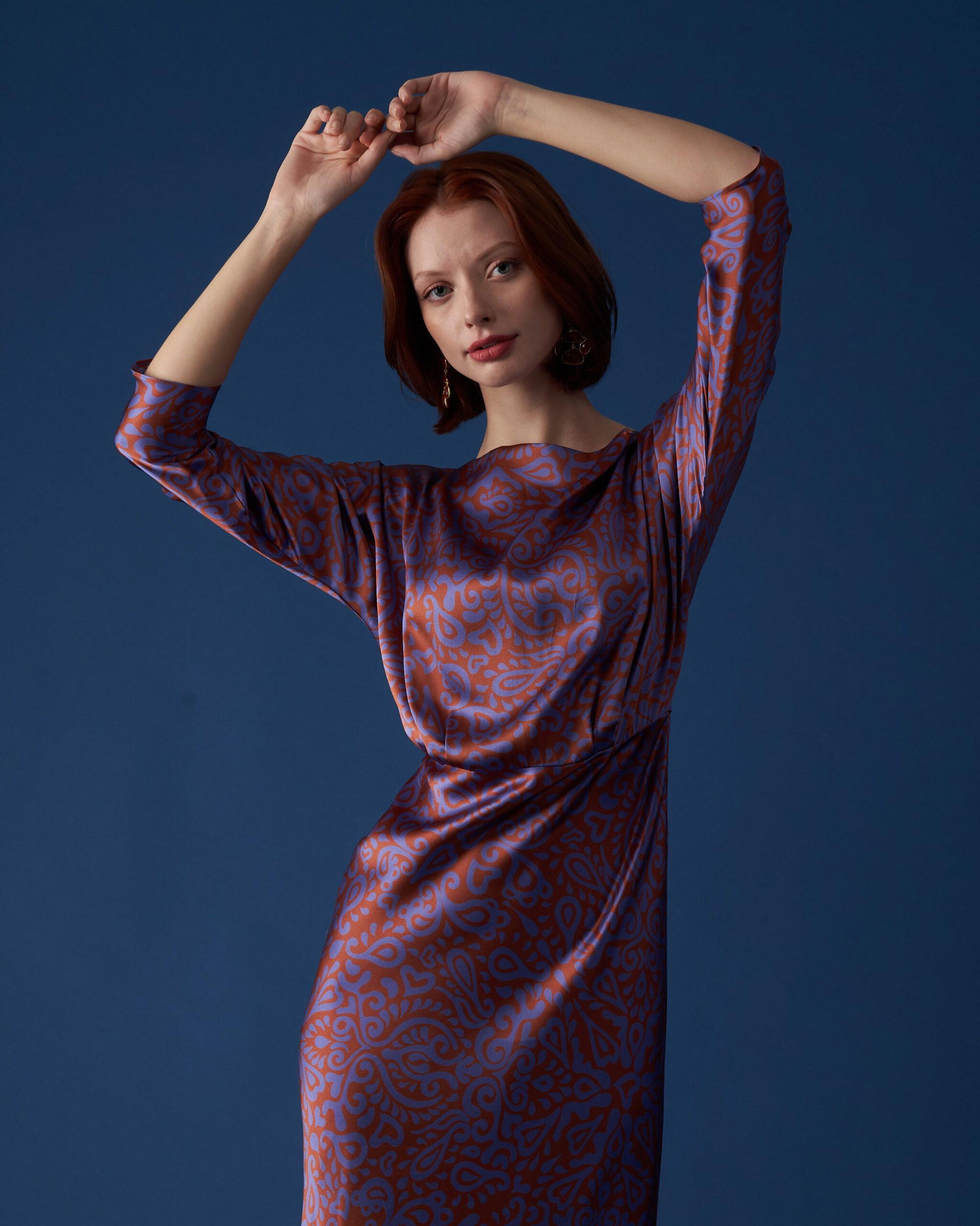 With it’s bias-cut skirt and three-quarter length dolman sleeve, the Caroline dress in pure silk satin has a feminine silhouette and vintage charm.