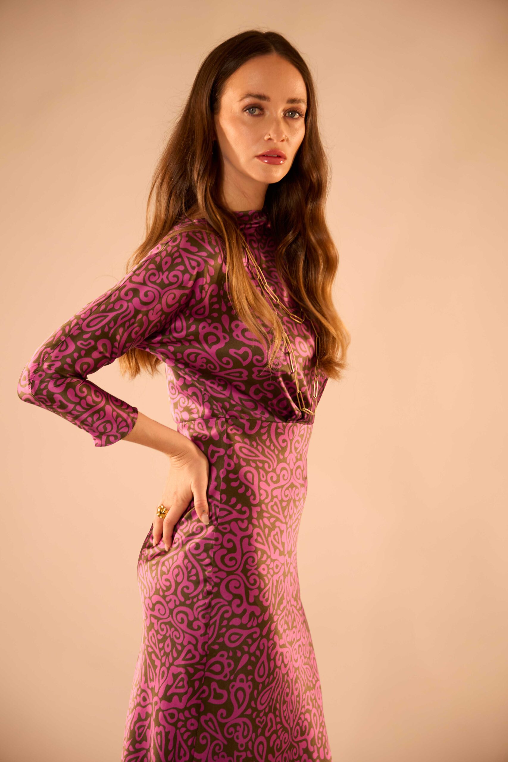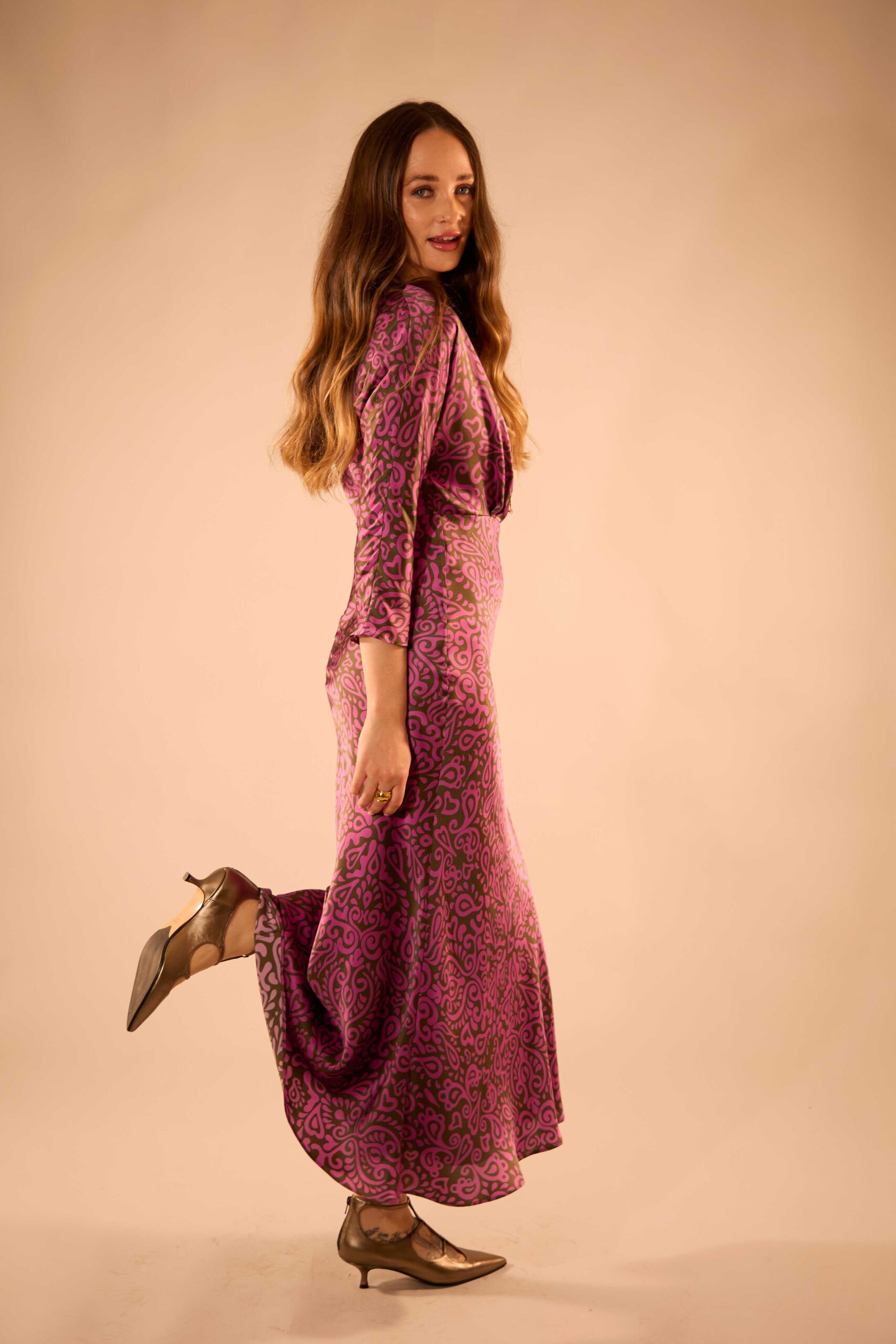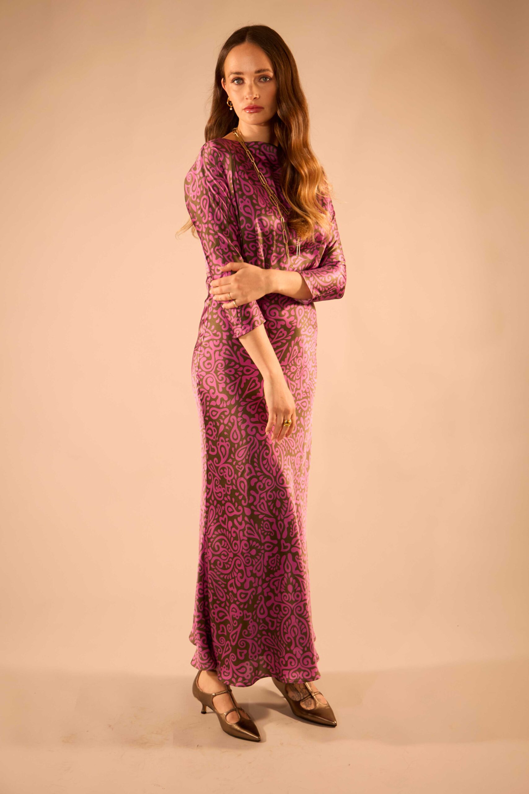 With it’s bias-cut skirt and three-quarter length dolman sleeve, the Caroline dress in pure silk satin has a feminine silhouette and vintage charm.