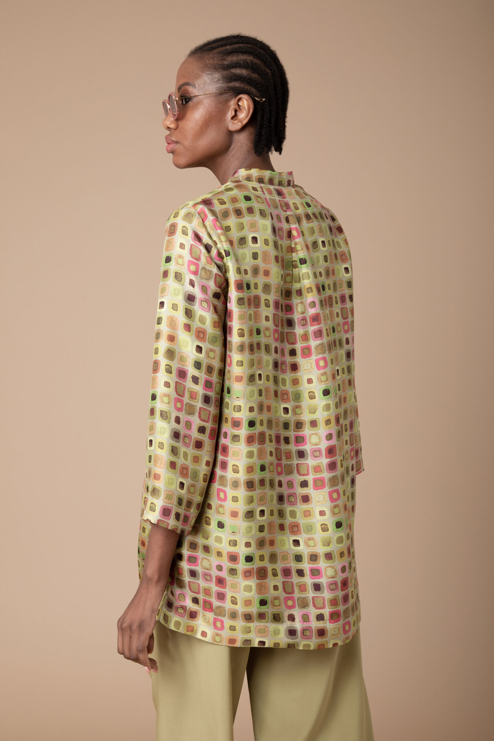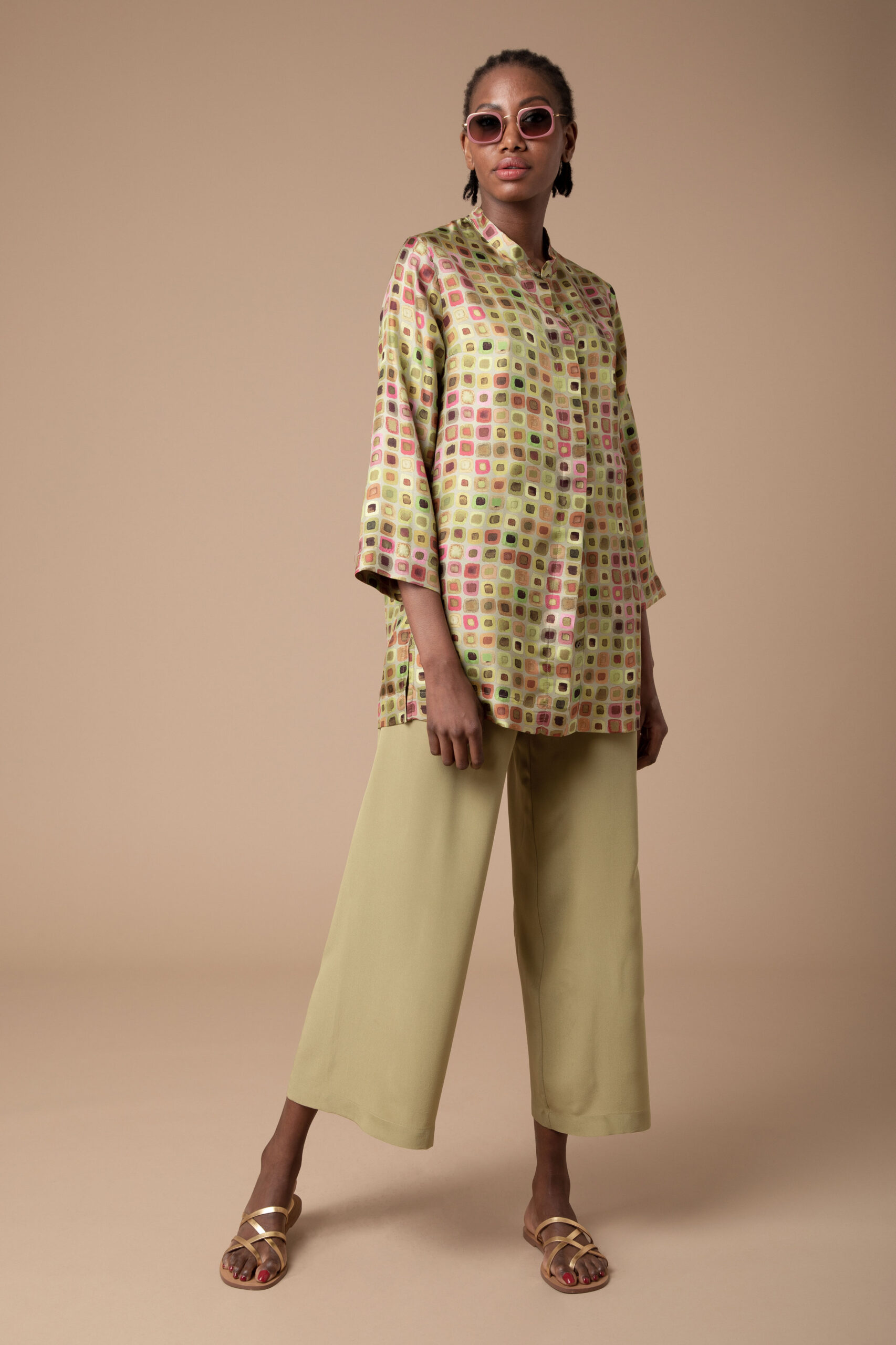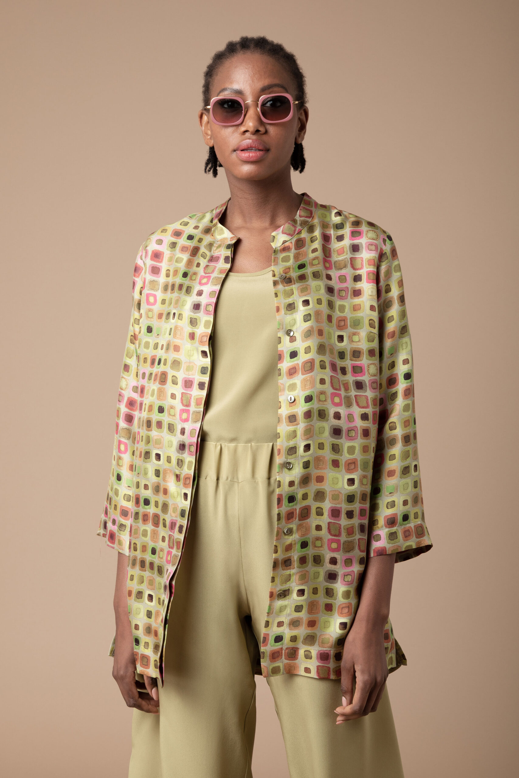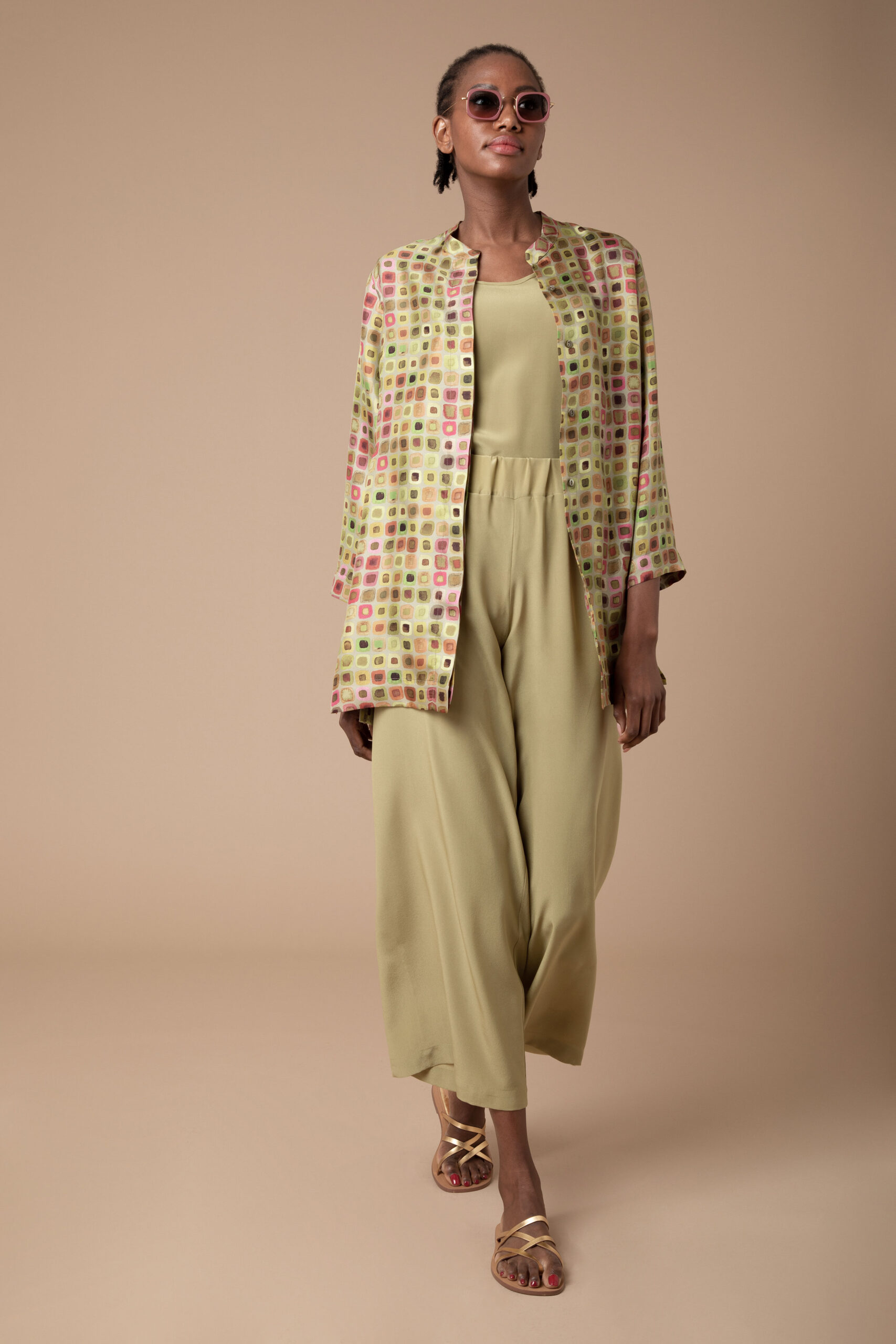 Wear it fastened as an elegant shirt or unbuttoned as a light-weight jacket over our silk palazzo pants and vest top in coordinating plain colours.