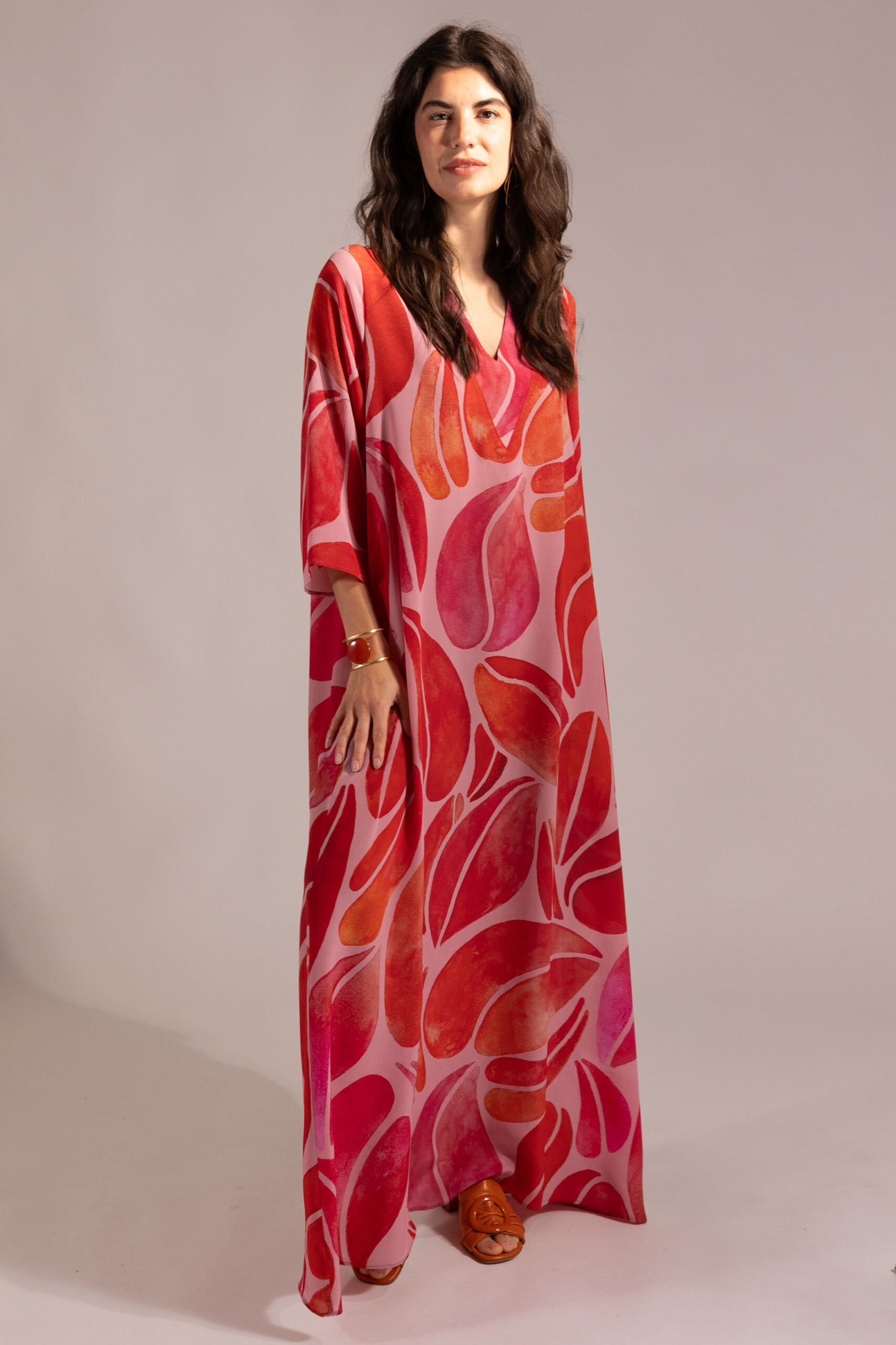Long V- neck Kaftan dress in pure silk crepe de chine.