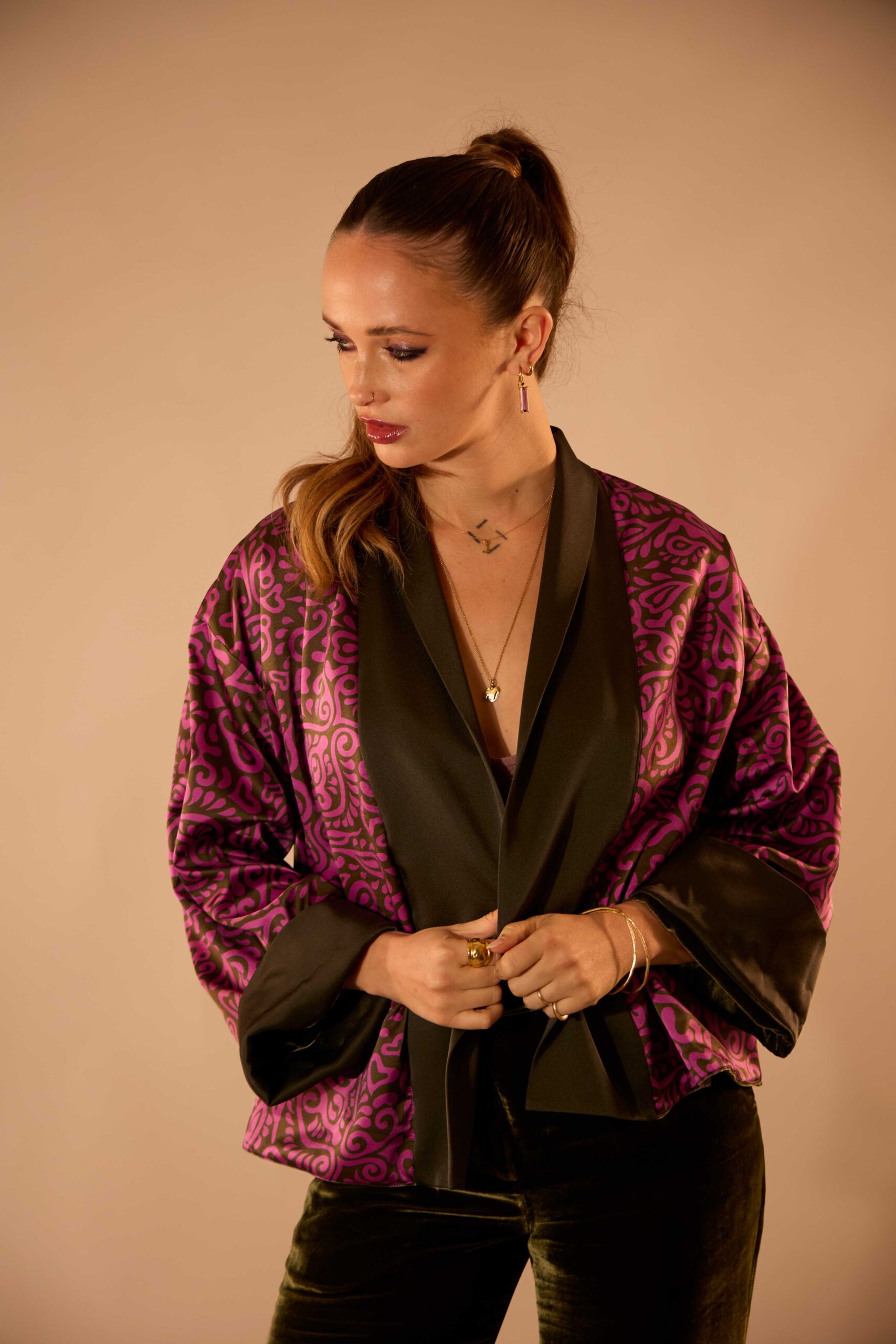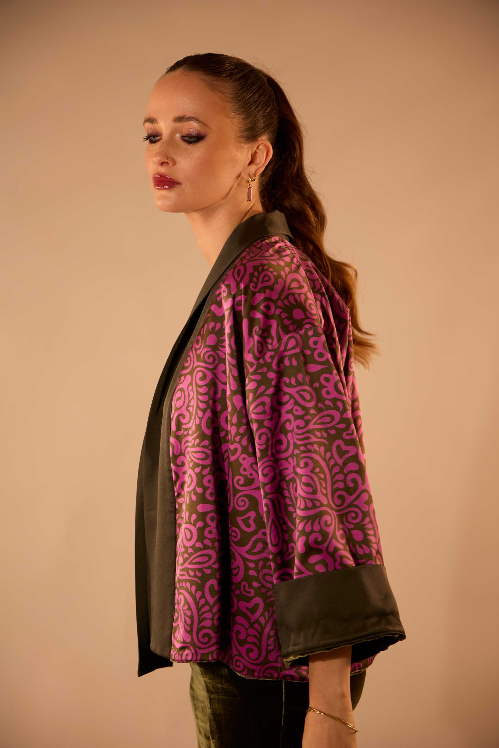 Reversible kimono style jacket in silk velvet and printed silk satin