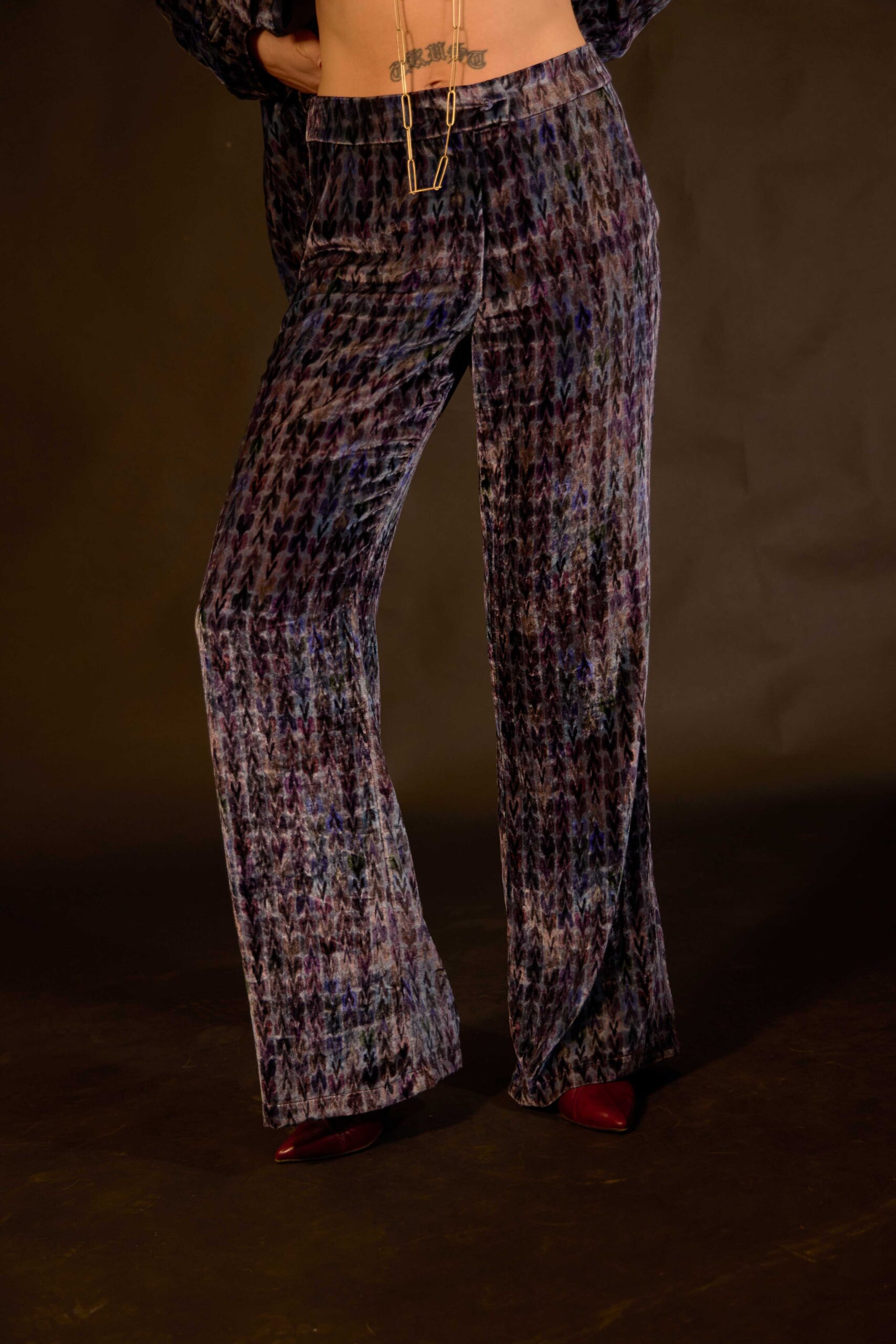 Slim fitting, slightly flared trousers in Joanna Lyle print on softest silk-blend velvet.