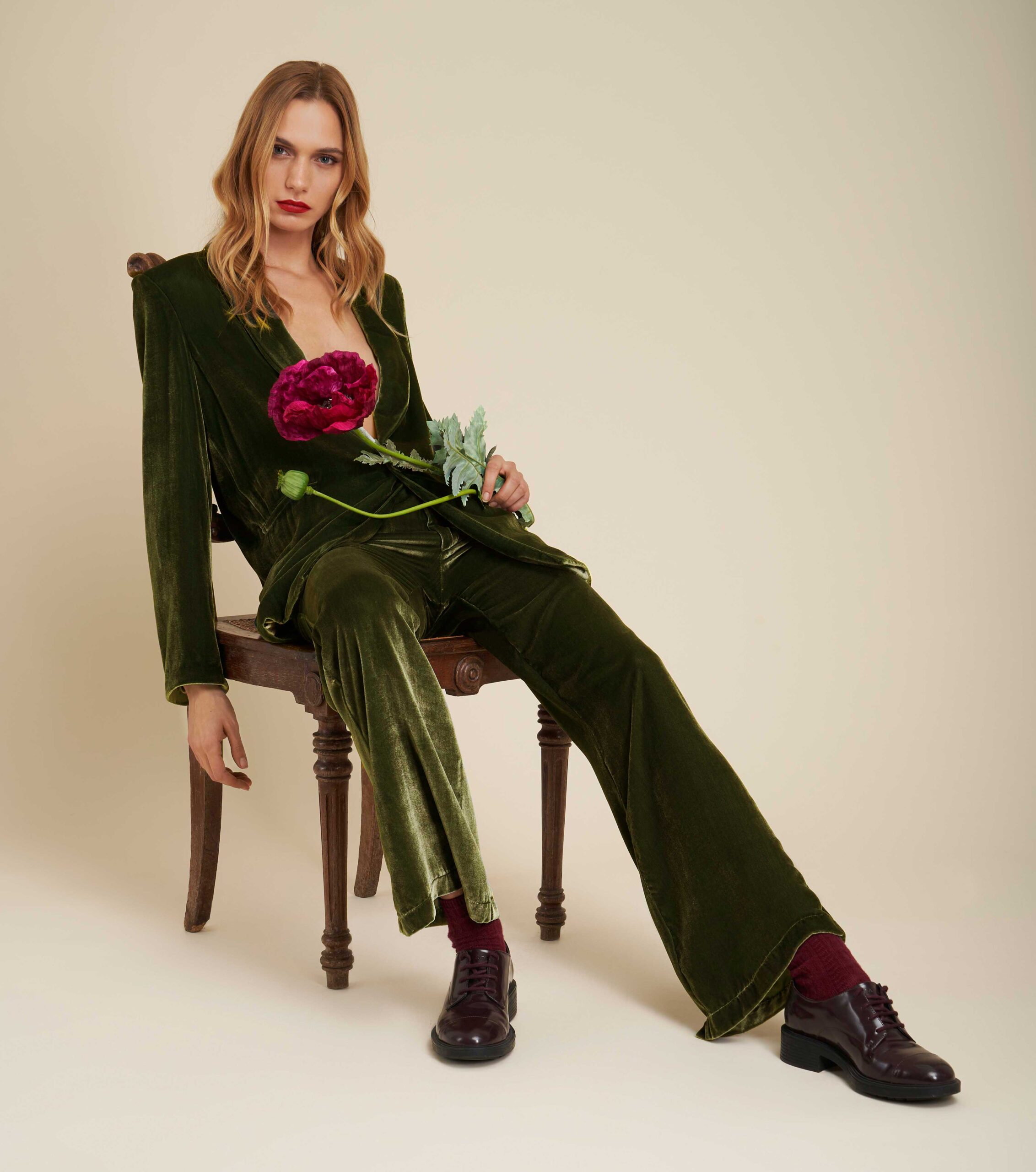 Slim fitting, slightly flared trousers in softest silk-blend velvet.