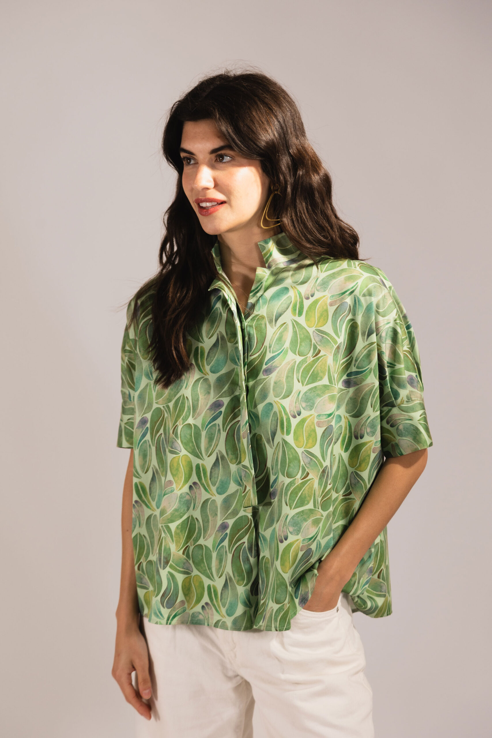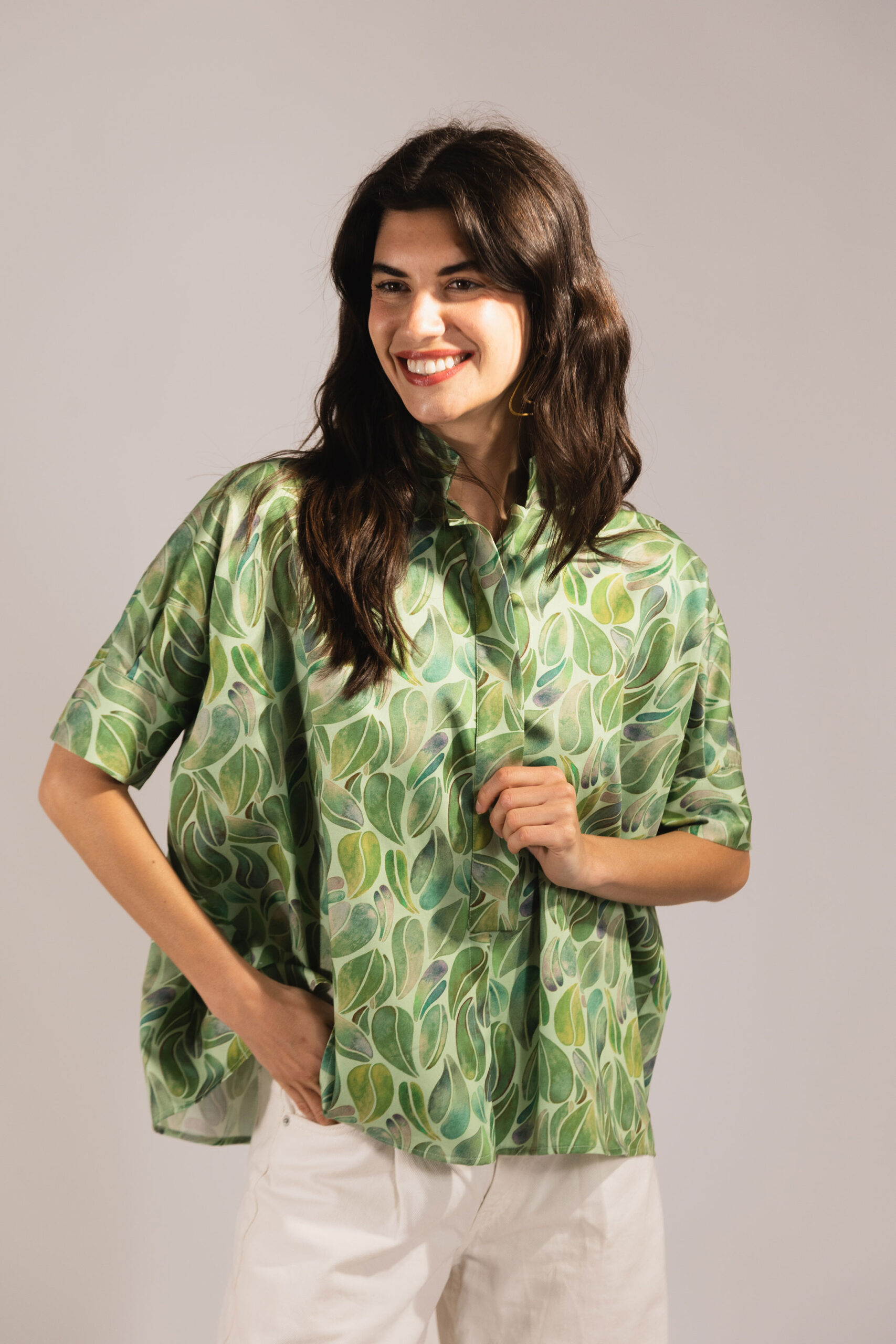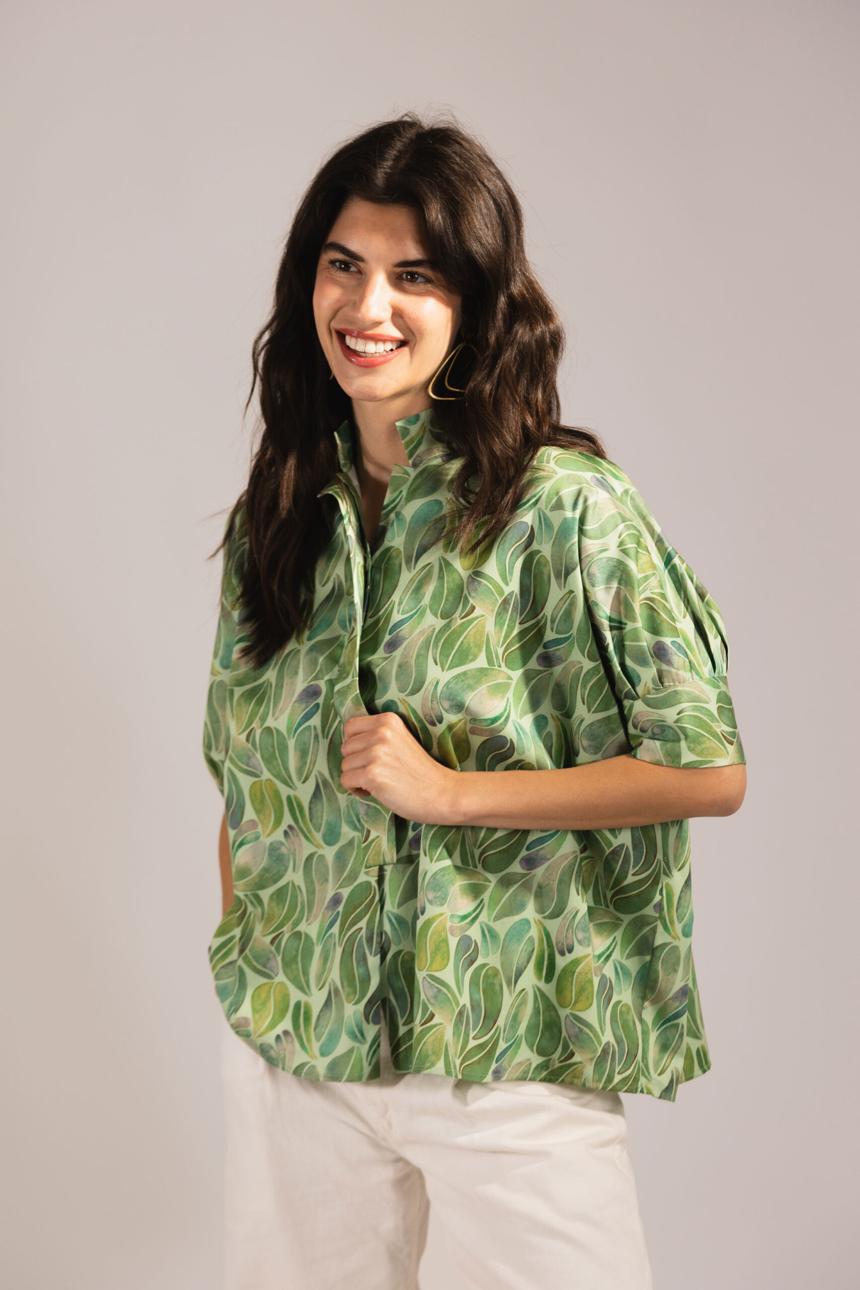 Lola is a boxy cut, over-sized shirt with grown on sleeves finishing just above the elbow with a wide cuff.