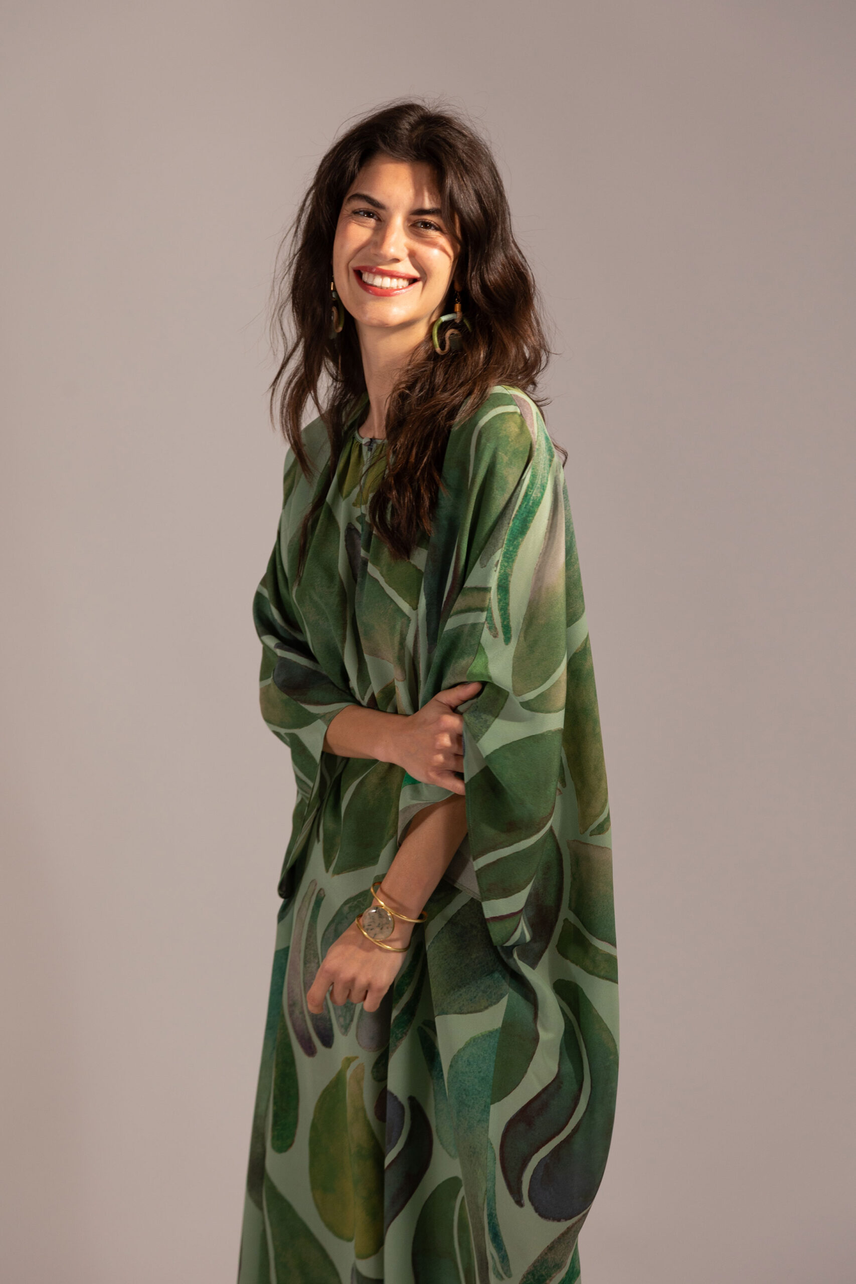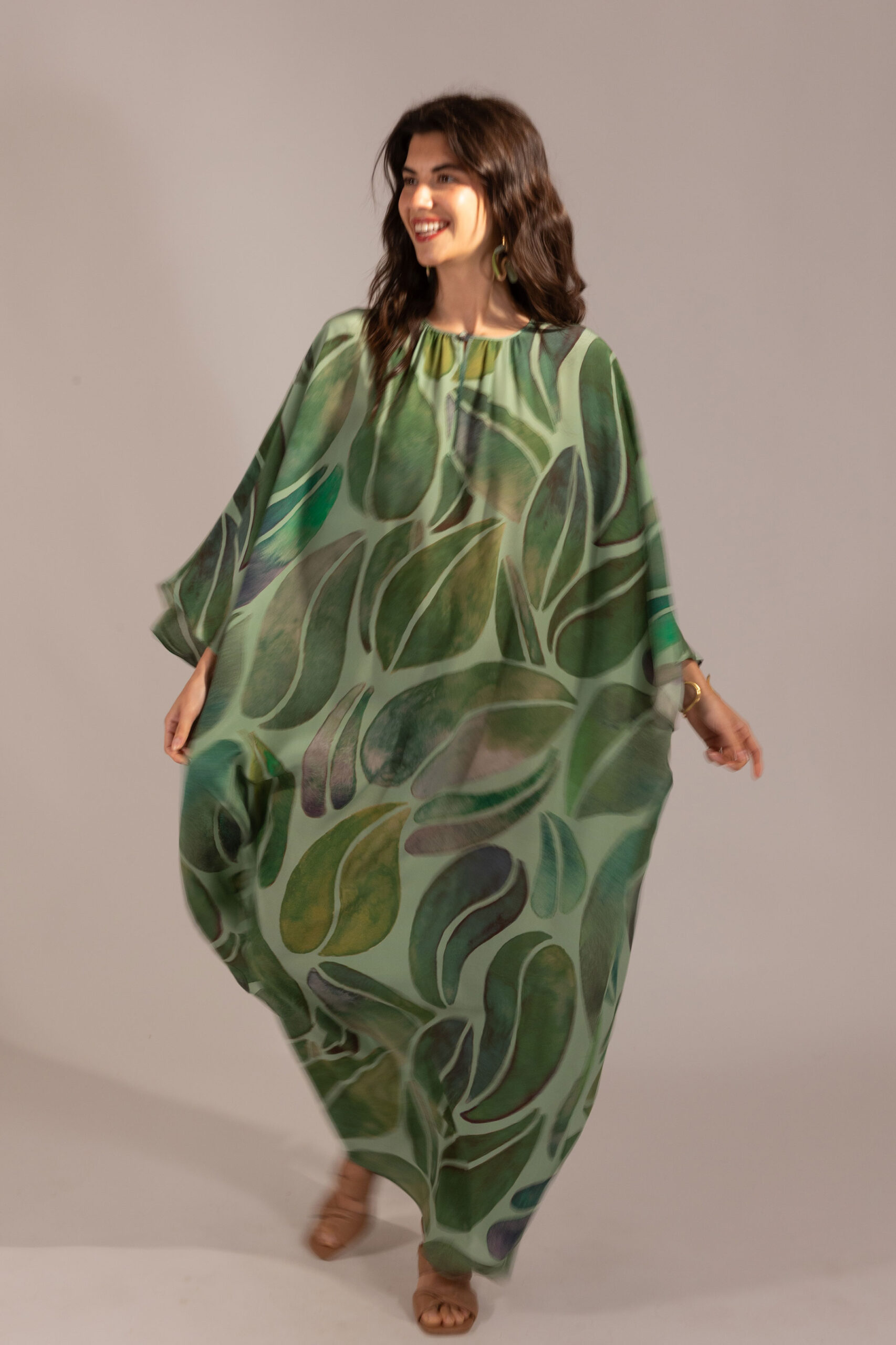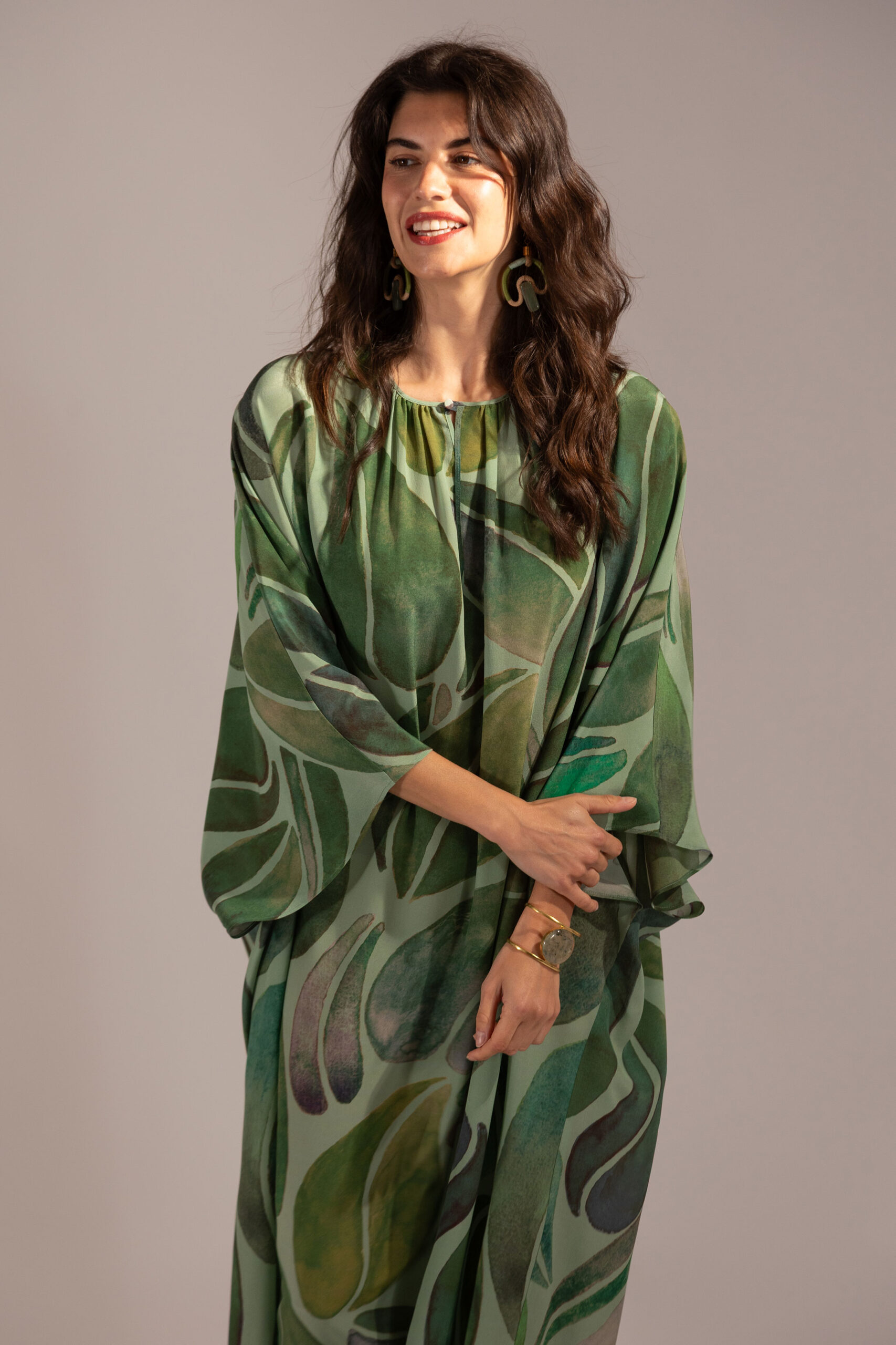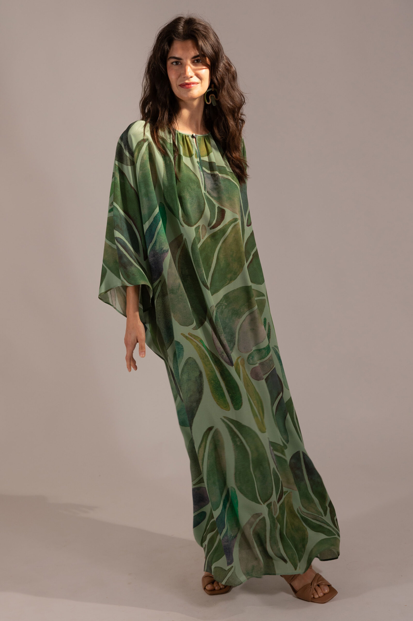 Long kaftan dress in pure silk crepe de chine in our new Grande Foglia print.