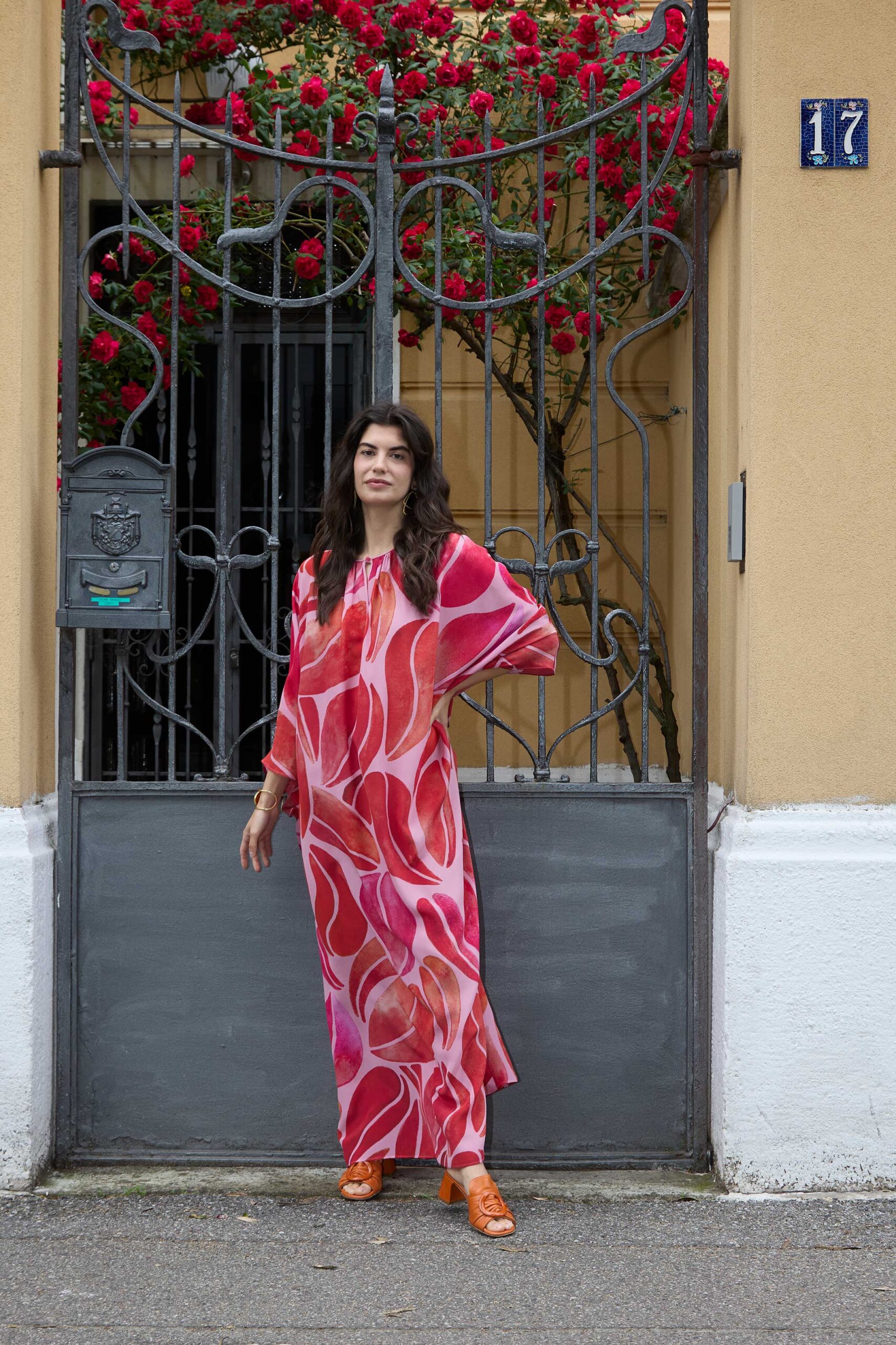 Long kaftan dress in pure silk crepe de chine in our new Grande Foglia print.