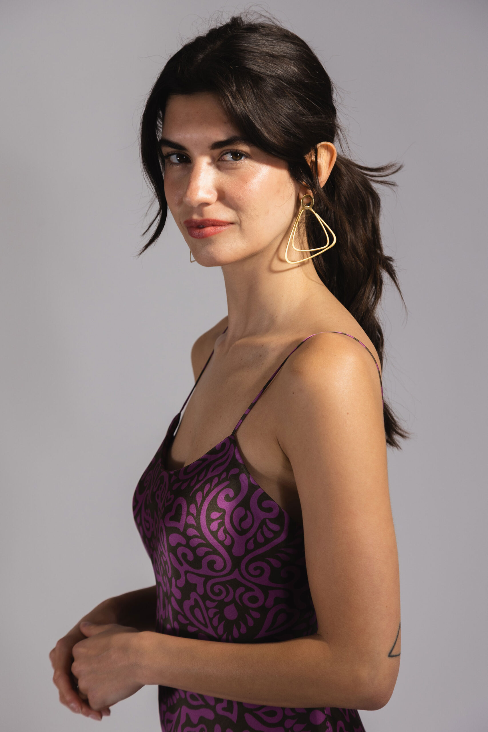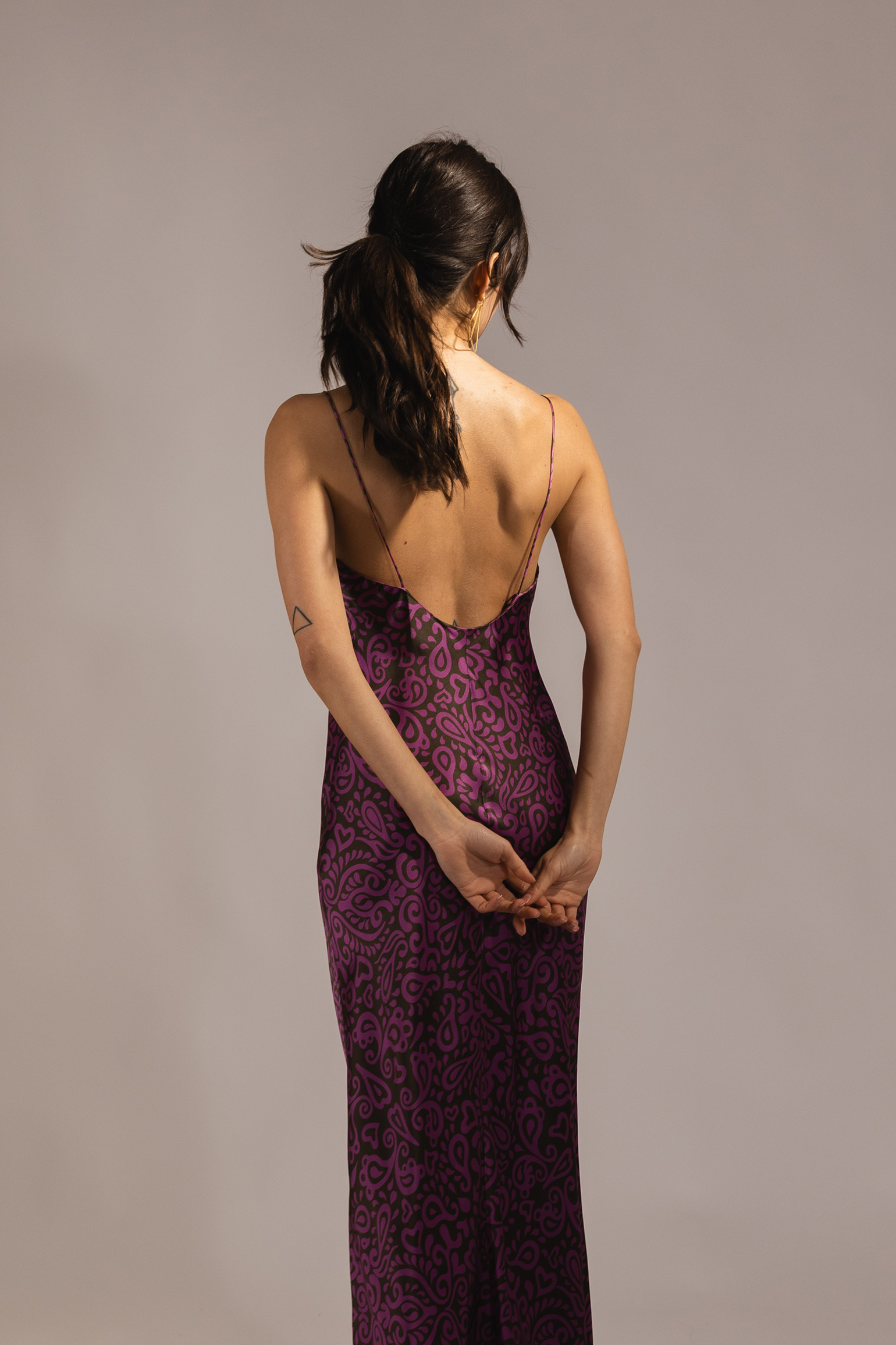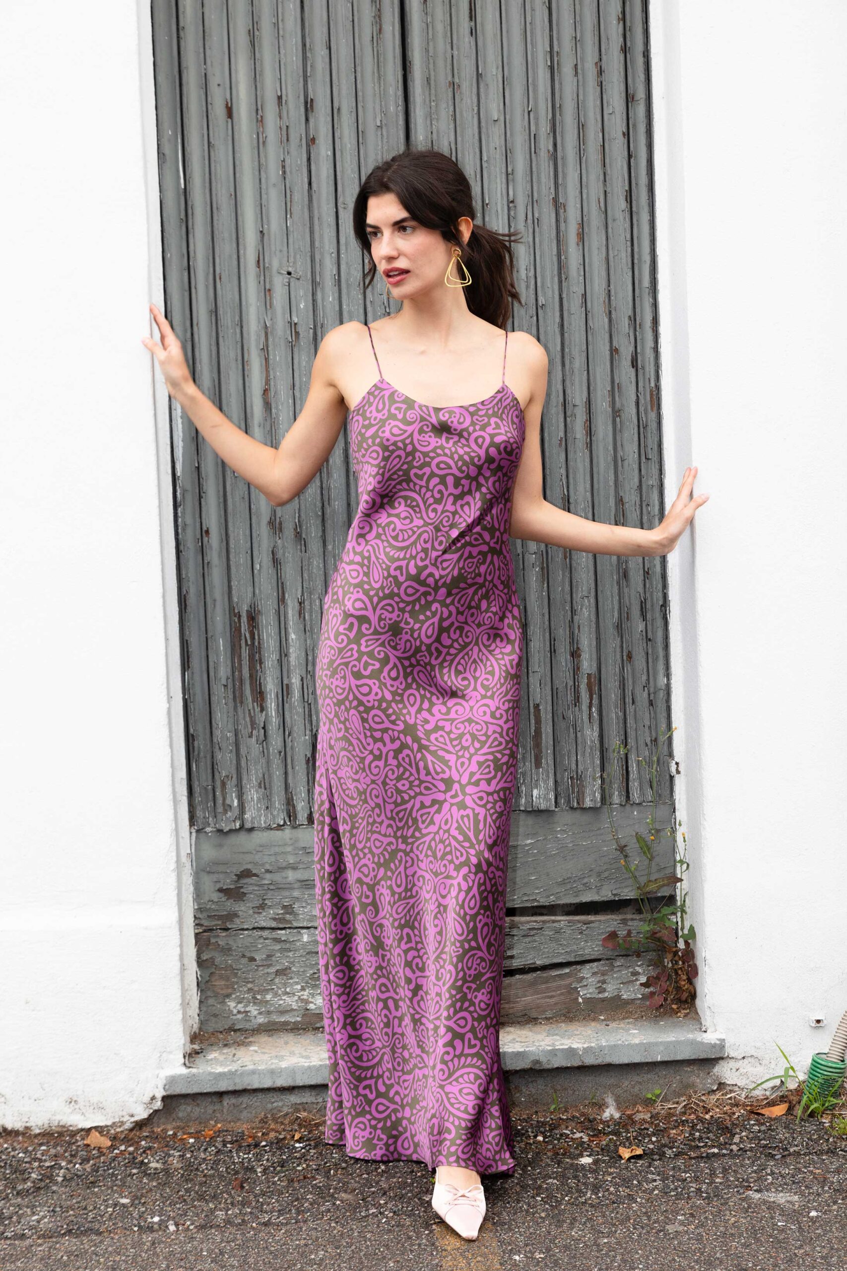 Sasha is our prettiest slip dress crafted in pure silk satin in our classic Casablanca print. This maxi-length dress features a low back and fine spaghetti straps.